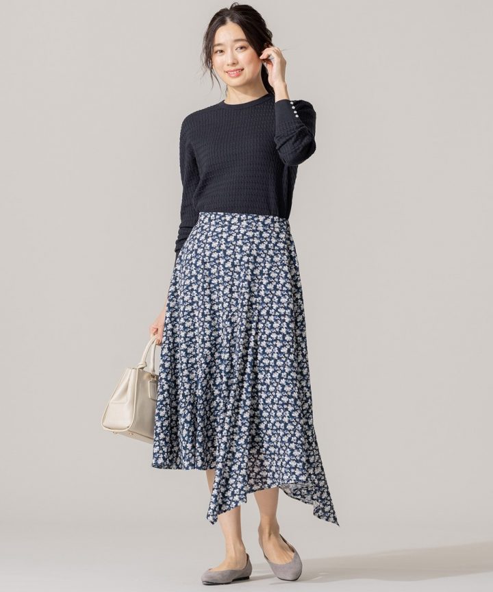 大人が取り入れやすいネイビーの花柄スカートは、ワントーンでまとめると失敗しませんよ♪