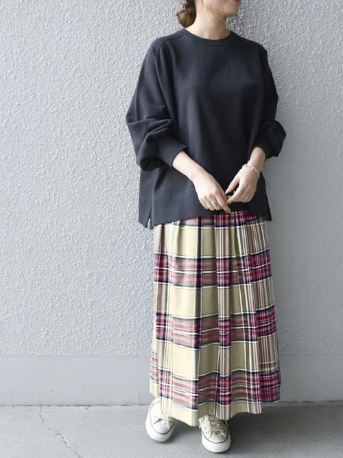 何気ないスウェットも、チェックスカートを合わせるとトラッドなおしゃれスタイルに変身♡