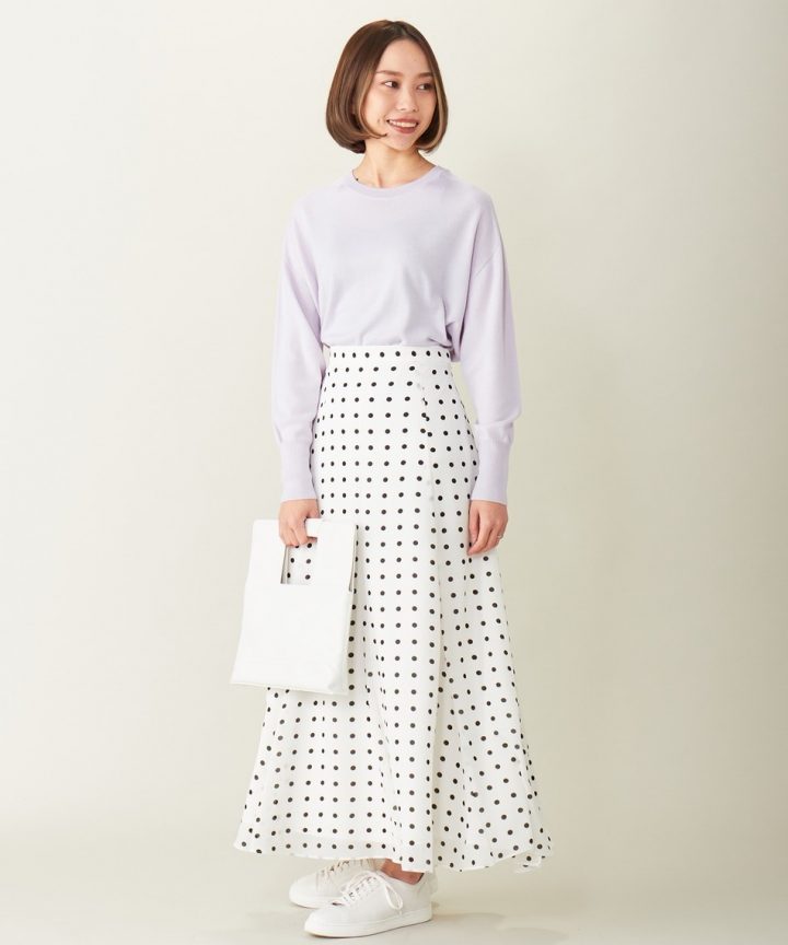 大きめドットが遊び心のある、履くだけで気分がUPするスカートです。