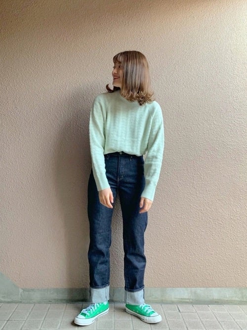 明るい色のニットやスニーカーを合わせても、濃色デニムだと幼さが気になりませんね。