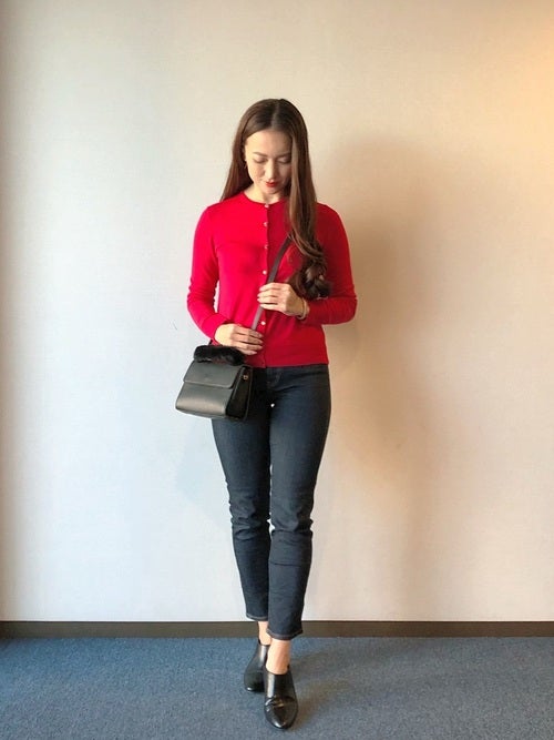 鮮やかな色が映えるユニクロのカーディガン。コンパクトなサイズ感だから、大人女性が着た時もきれいめに見えるんです。