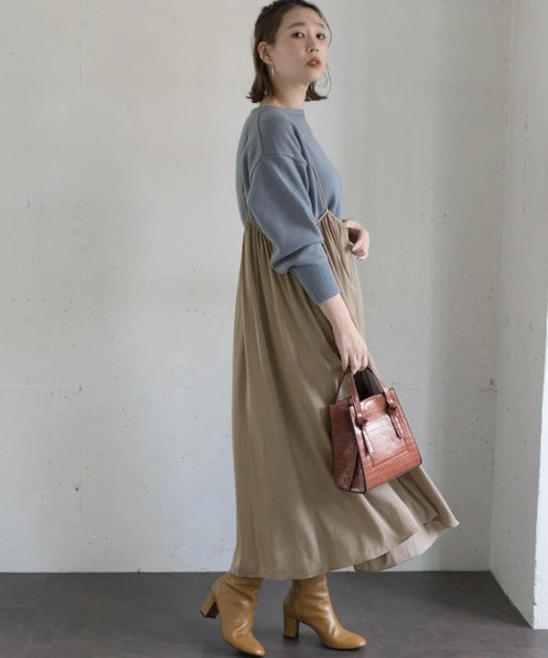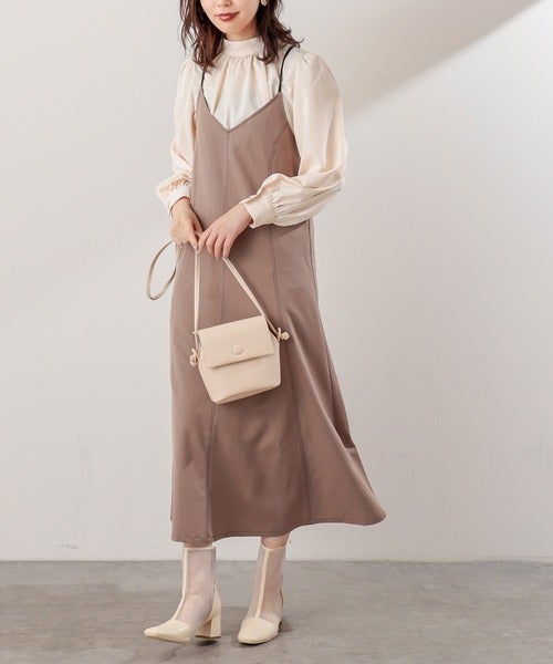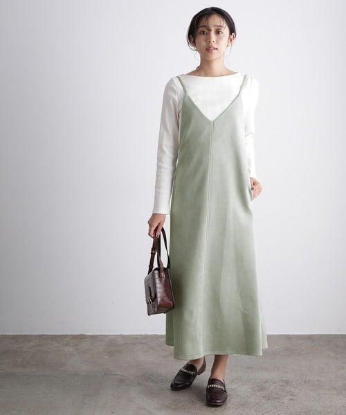 キャミワンピースも、同系色のトップスを合わせれば、すぐにトレンディなワントーンコーデに仕上がります。