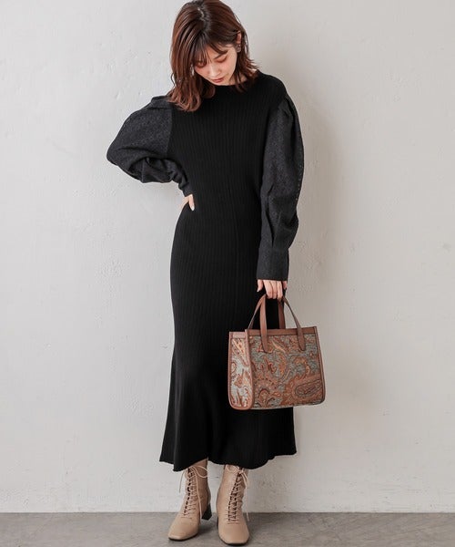 袖がレース素材に切り替えられているから、黒でも地味見えしないニットワンピース。
