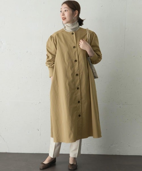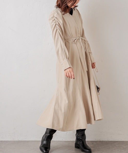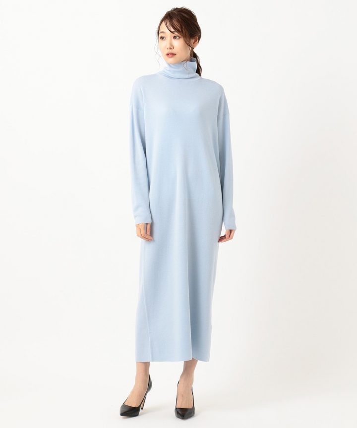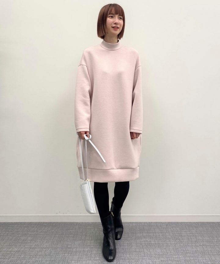 クルーネックのノーカラーギャザーワンピースにはハイネックのトップスをインナーに使ってみて。