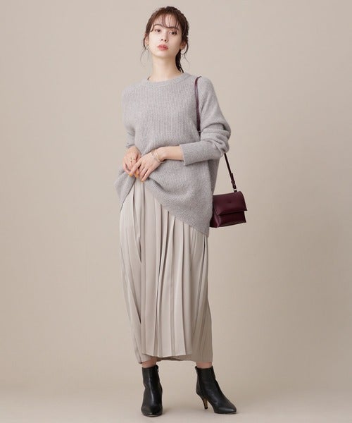 プリーツスカートのおかげで、ワントーンコーデも地味見えしない着こなしになっていますね。