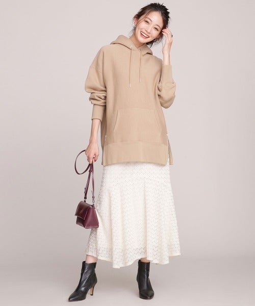 ガーリーなイメージがあるレーススカートですが、パーカーでカジュアルダウンすれば大人女性でも着こなしやすいです。