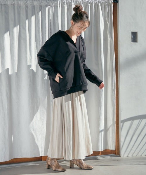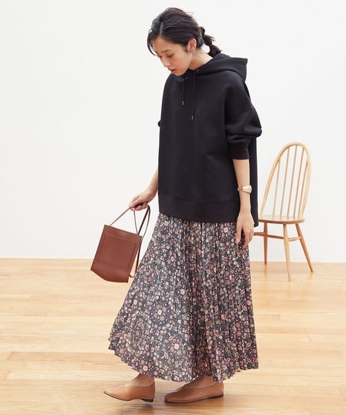 カジュアルなパーカーを合わせた時もレディライクに決まっていますね。