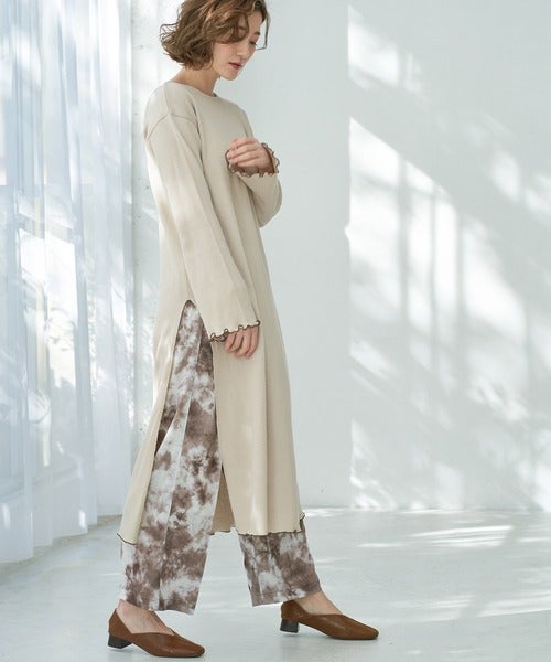 ロングチュニックカットソーとタイダイ柄パンツのセットアップアイテム。