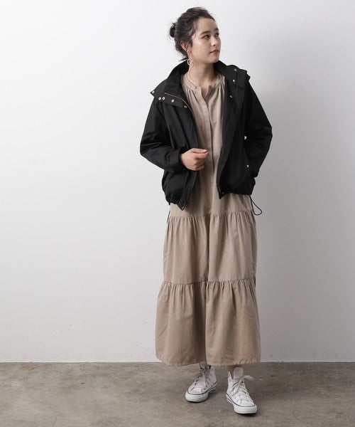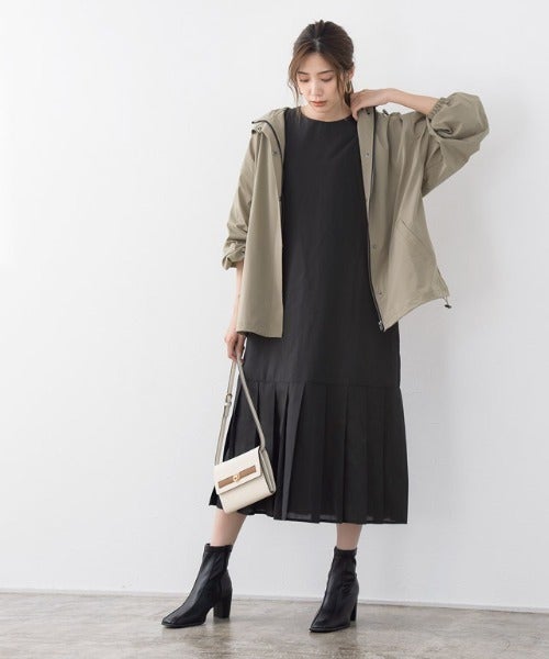 黒ワンピースなら、オーバーサイズマウンテンパーカーを合わせても着膨れしません。