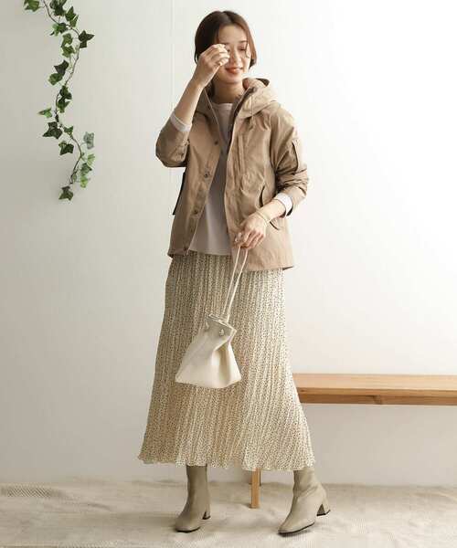 ドット柄やお花柄など女っぽさを引き出してくれるスカートを使うと、カジュアルなマウンテンパーカーコーデも女っぽさあふれる着こなしに。
