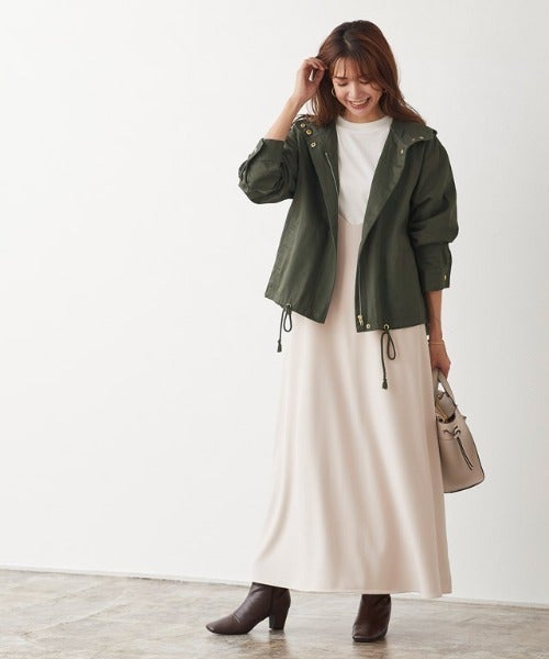 オーバーサイズのマウンテンパーカーなら、ベーシックなワンピースに羽織るだけでも今年らしさが出ます。