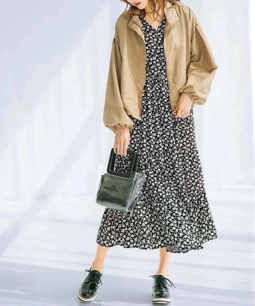 ヴィンテージルックな花柄ワンピースにロング丈のマウンテンパーカーを合わせて大人顔の着こなしを。