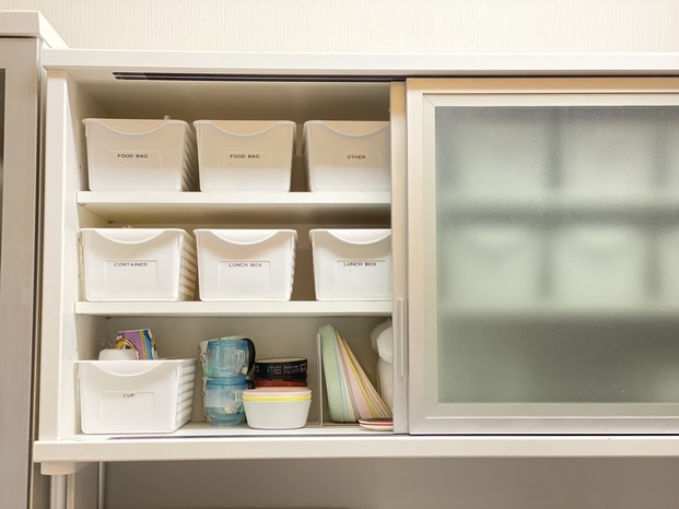取っ手が付いているので、カゴごと取り出すのも楽ちん!カゴごとにジャンル分けをして収納すると、時短にもなりますよ。