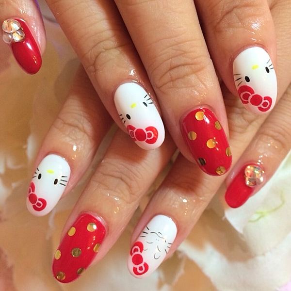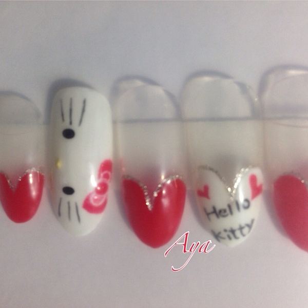 シンプルなホワイトのフレンチネイルに、真っ赤なリボンと黄色のリボンで、キティーとミミィちゃん♡