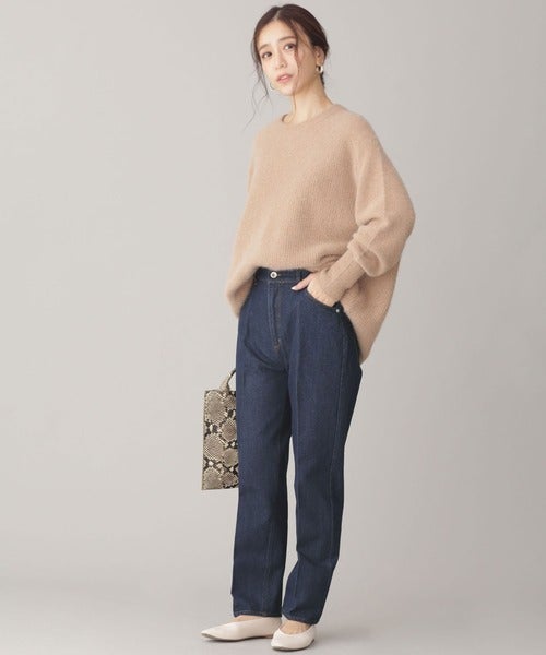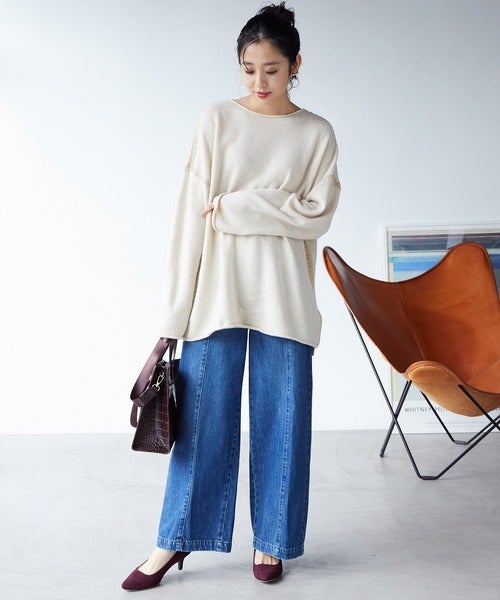 カジュアル感の強いワイドなデニムパンツにオーバーサイズのニットトップスを合わせて抜け感のある着こなしに。