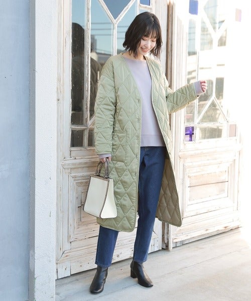 カジュアルな中にも女性らしい、やわらかさを引き出してくれるキルティングコート。
