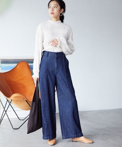 濃色デニムのワイドパンツなら、甘めなブラウスを合わせても可愛すぎないので大人女性におすすめです。
