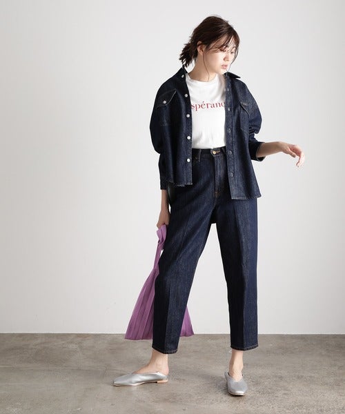 アンクル丈のデニムパンツを使うことでコーデのバランスを整えてみて。