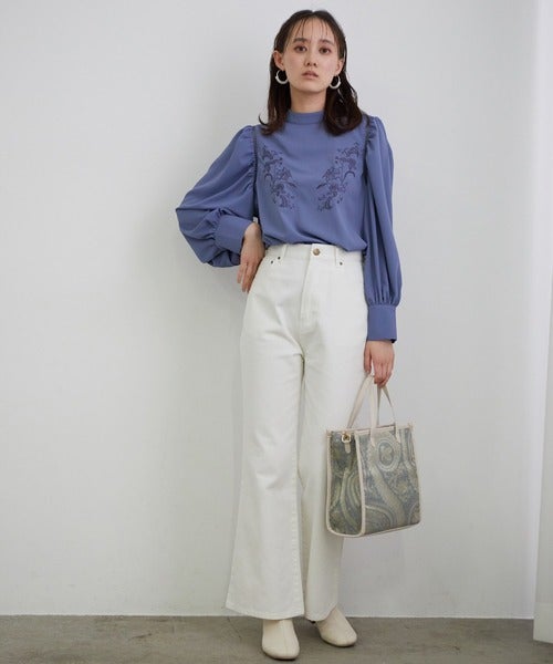 ホワイトデニムにブルーのブラウスを合わせて春を意識したデニムコーデ。