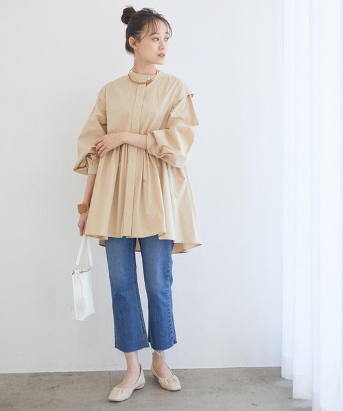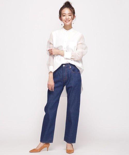 カジュアルなデニムコーデですが、ボリュームのあるブラウスを合わせることで女性らしい、やわらかさが出ます。