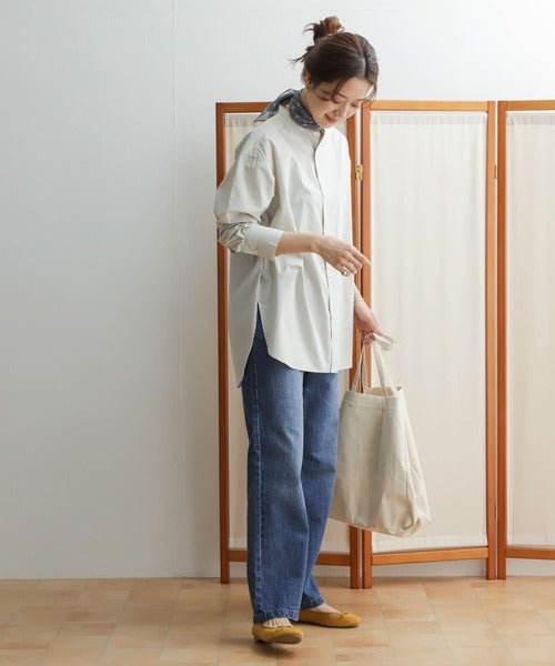 シャツとデニムパンツはシンプルなものを使っていますが首元にスカーフを巻いていることで、こなれて見えますね。