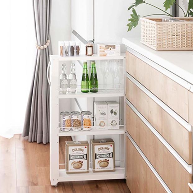 高さのある洗剤など、収納するアイテムに合わせて棚の高さを変えられる可動式の収納棚なので、使い勝手もよくて機能的。サイドのメッシュパネルを使えば、ハンガーやお掃除アイテムを収納することもできます。