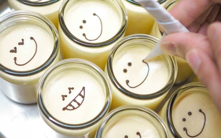 従来の「しあわせプリン」との違いは、自ら願いごとをしながら、チョコペンで笑顔を書くこと。さらにオンラインで購入できるので、冷蔵で配送しても味が変わらないように、レシピも少し工夫されている。