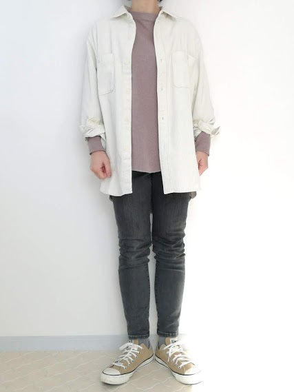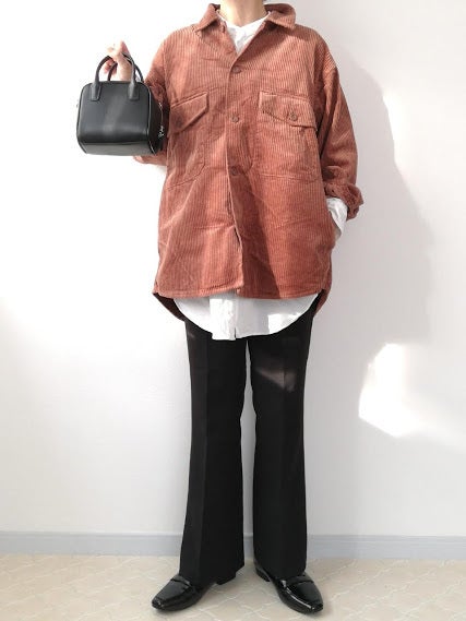 カジュアルなコーデュロイシャツ、アラフォーさんが着るならシンプルなモノトーン合わせがおすすめ。