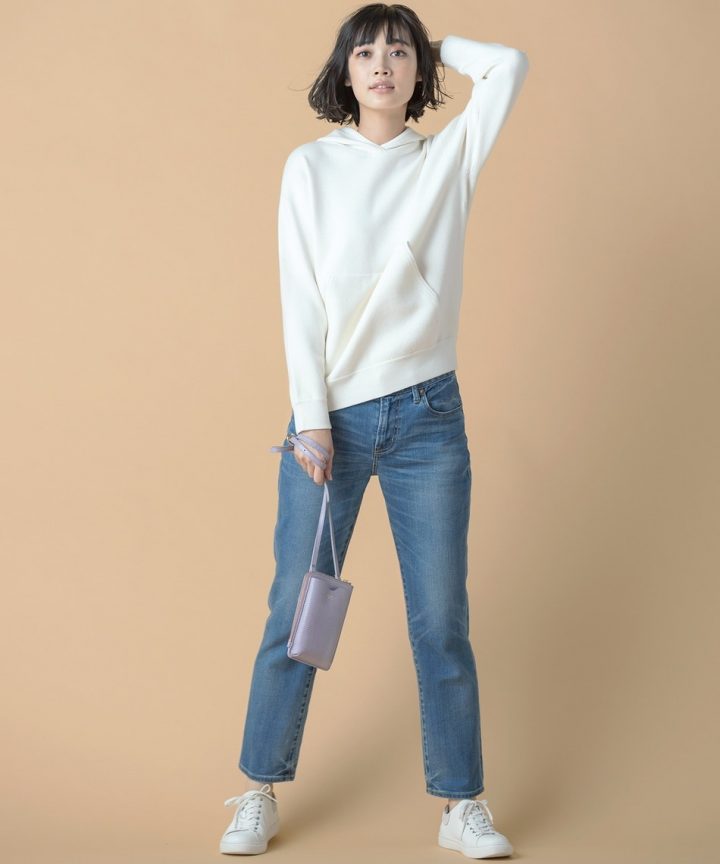 パーカーとデニムパンツの定番コンビ。