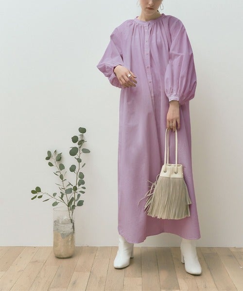 パープルのワンピースなら、一枚着るだけで着映えするコーディネートが完成します。