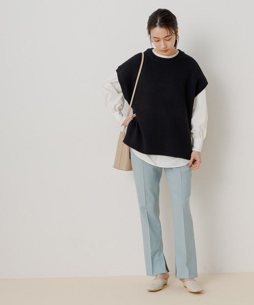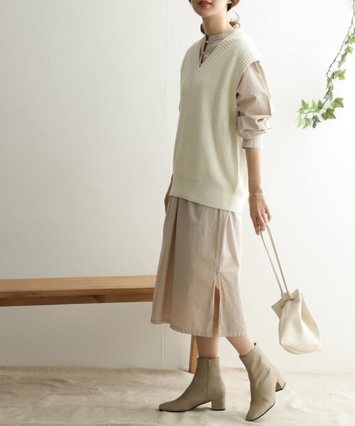 ニットベストを重ねるだけで、トレンドのレイヤードスタイルを楽しめます。