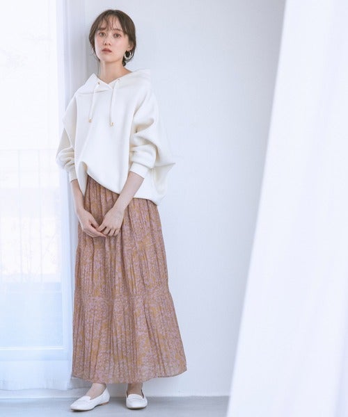 フェミニンなスカートを合わせることで、レディライクなカジュアルスタイリングに仕上げてみて。