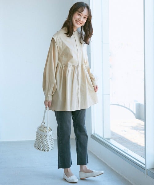 ふわっとしたボリューミーなギャザー切り替えチュニックで女性らしいシルエットのカジュアルコーデを。