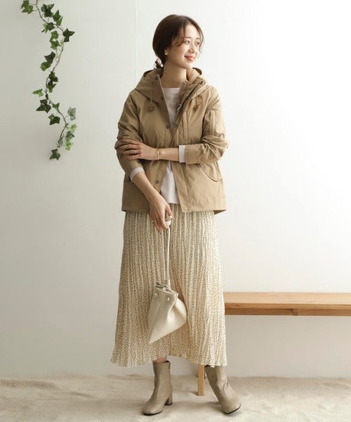 ドット柄のプリーツスカートが女っぽさを引き出してくれているので、マウンテンパーカーでカジュアルダウンしてもおしゃれ。
