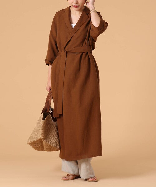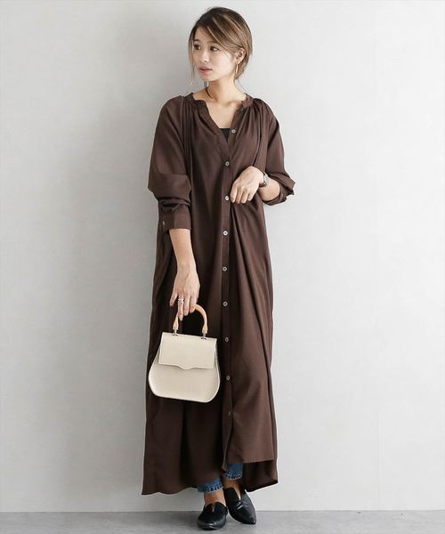 一見アウターに見えるブラウンワンピース。優雅で大人女性の余裕感たっぷりのデザインなので、ビジネスカジュアルとして着ても好印象まちがいなし。