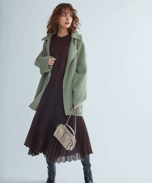 女性らしいプリーツワンピースに、オーバーサイジングなアウターの合わせ方も程良いこなれ具合が可愛い。デートにもおすすめの着こなしです。