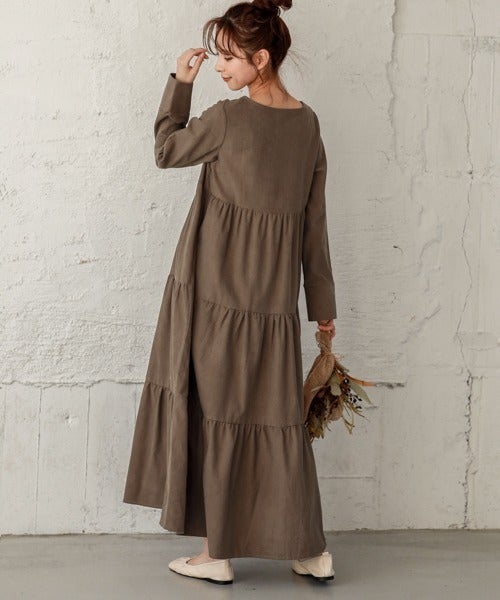 今年人気のティアードデザインのブラウンワンピースです。コーデュロイ素材なので秋の着こなしに特におすすめ。