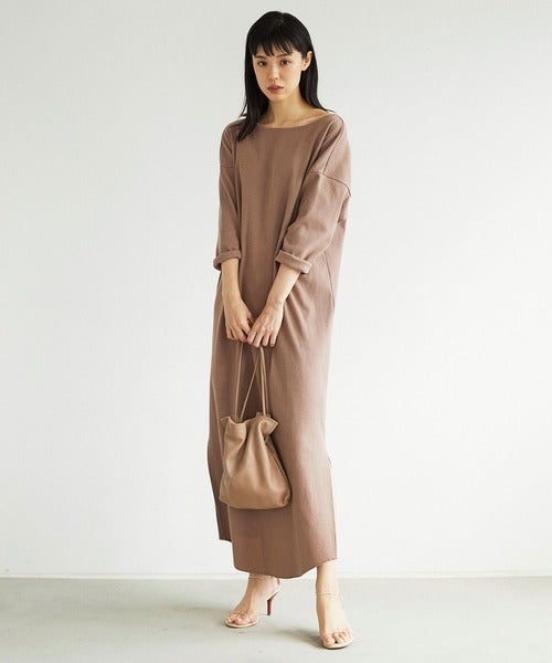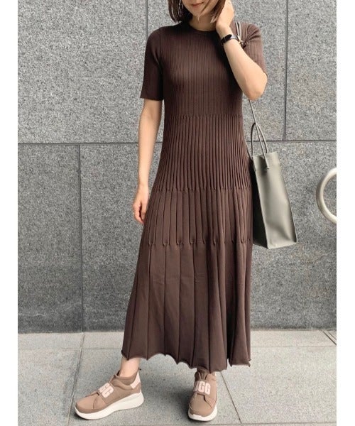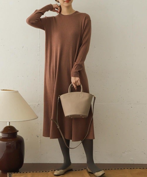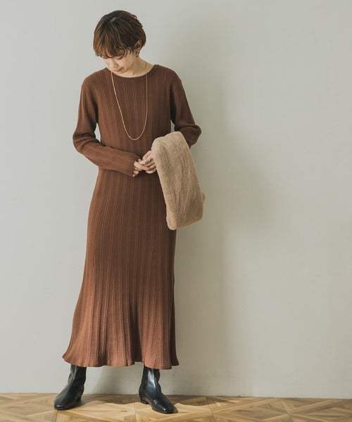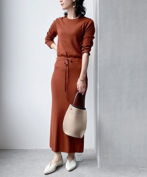 セットアップに見えるリブニットのブラウンワンピース。ウエストがキュっと絞れるので、リラクシーな雰囲気を持ちながら、綺麗なIラインを描いてくれます。