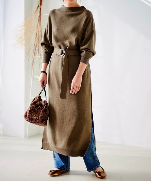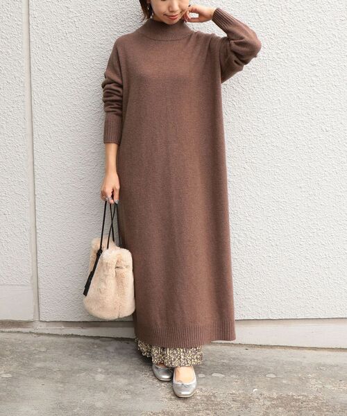 ニット素材のブラウンワンピースを使った冬コーデ。サイドにスリットの入ったワンピースはレイヤードスタイル向け。