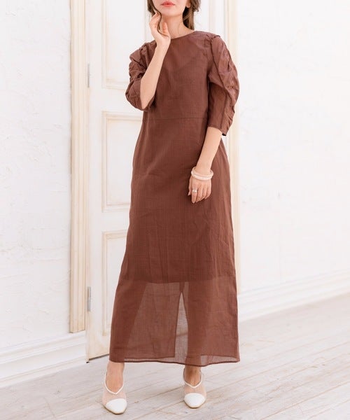 膝丈のきれいめムードたっぷりのブラウンワンピース。
