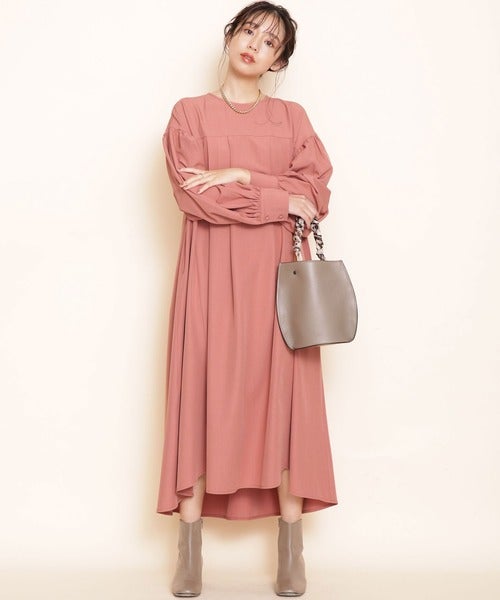 タックの入ったボリューミーなワンピースは、スッキリと見える小物と合わせるのがベターです。