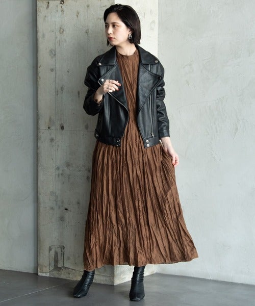 ワッシャー素材のブラウンワンピースは表情感があり、1枚でも印象的なコーディネートが叶います。