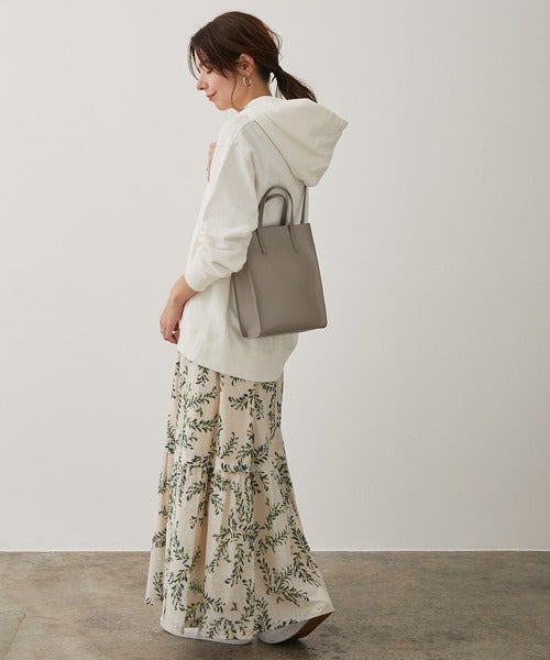 カジュアル感の強いパーカーには、大人の落ち着きを感じるリーフプリントのギャザースカートを合わせてみて。