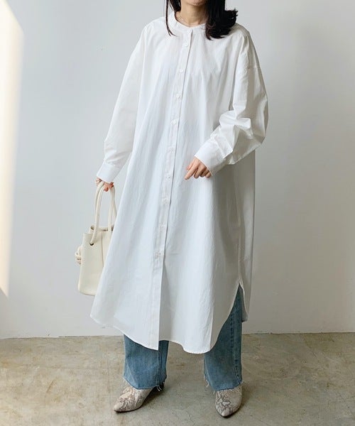 きれいめな白シャツワンピースなら、カジュアルなデニムパンツを合わせても大人っぽい。