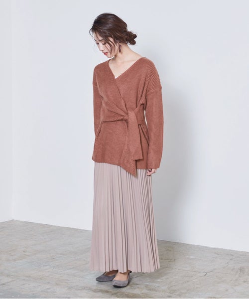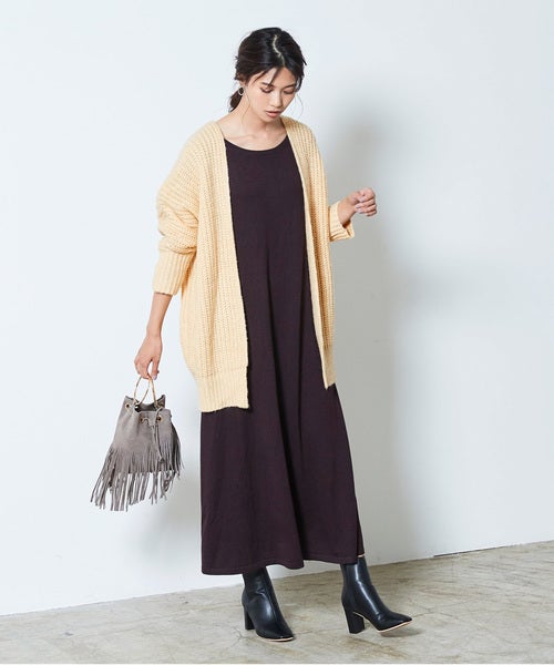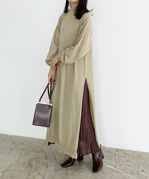 深めにスリットが入ったワンピースなら、スカートを合わせた時もうまく馴染みます。