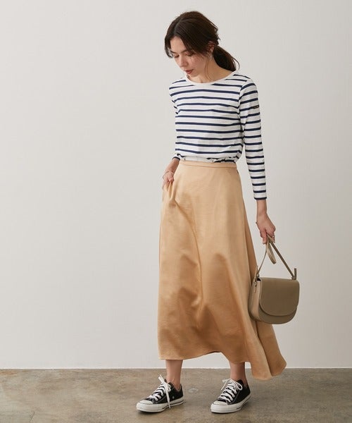 光沢のあるサテンスカートで上品見えを叶えましょう。