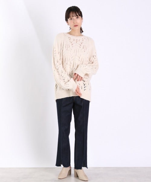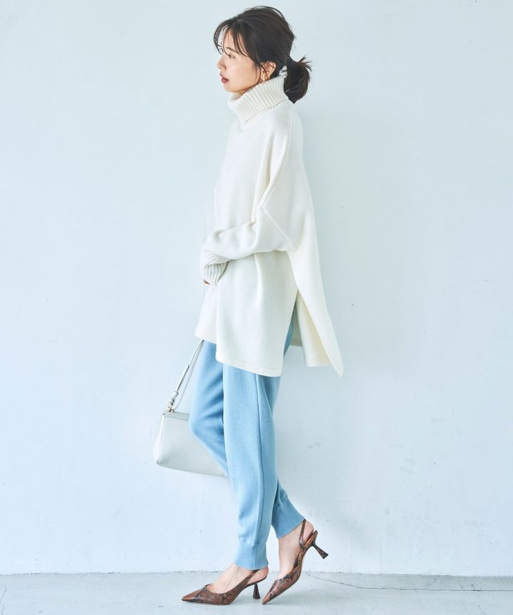 これからの時期モノトーンコーデの重みが気になってくるので、透かしユルニットで見た目を軽やかに仕上げてみて。