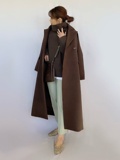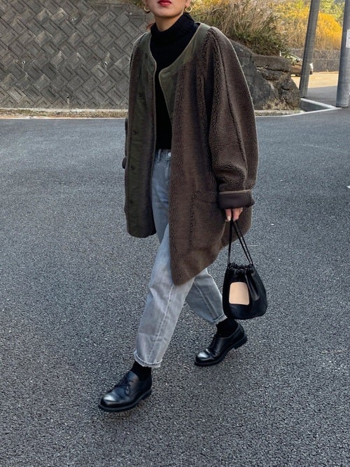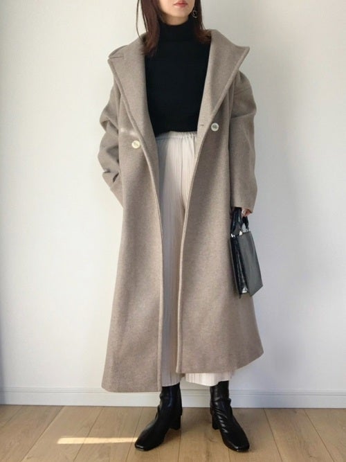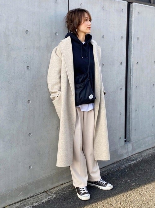 部屋着っぽく見えないように、きれいめなチェスターコートを羽織るとこなれ感がアップします。