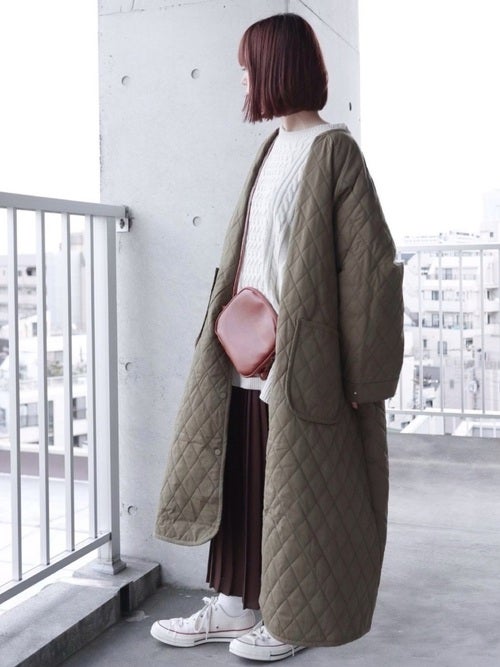 オーバーサイズのキルティングコートがイマドキムードを盛り上げてくれますよ。