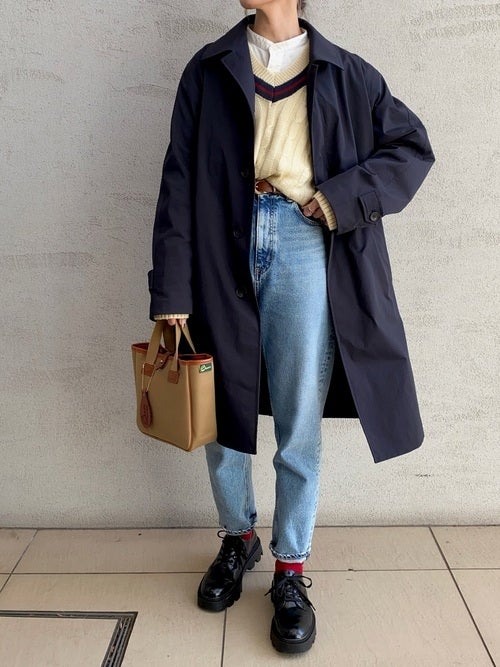 春まで使えるアウターが続々登場しているユニクロ。ネイビーのステンカラーコートは、清潔感のある着こなしを後押ししてくれますよ。
